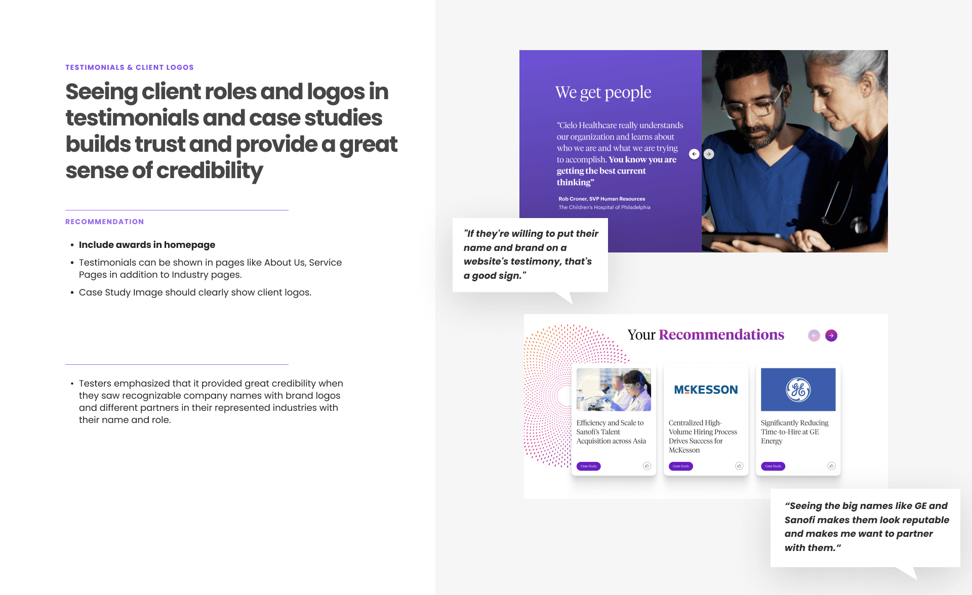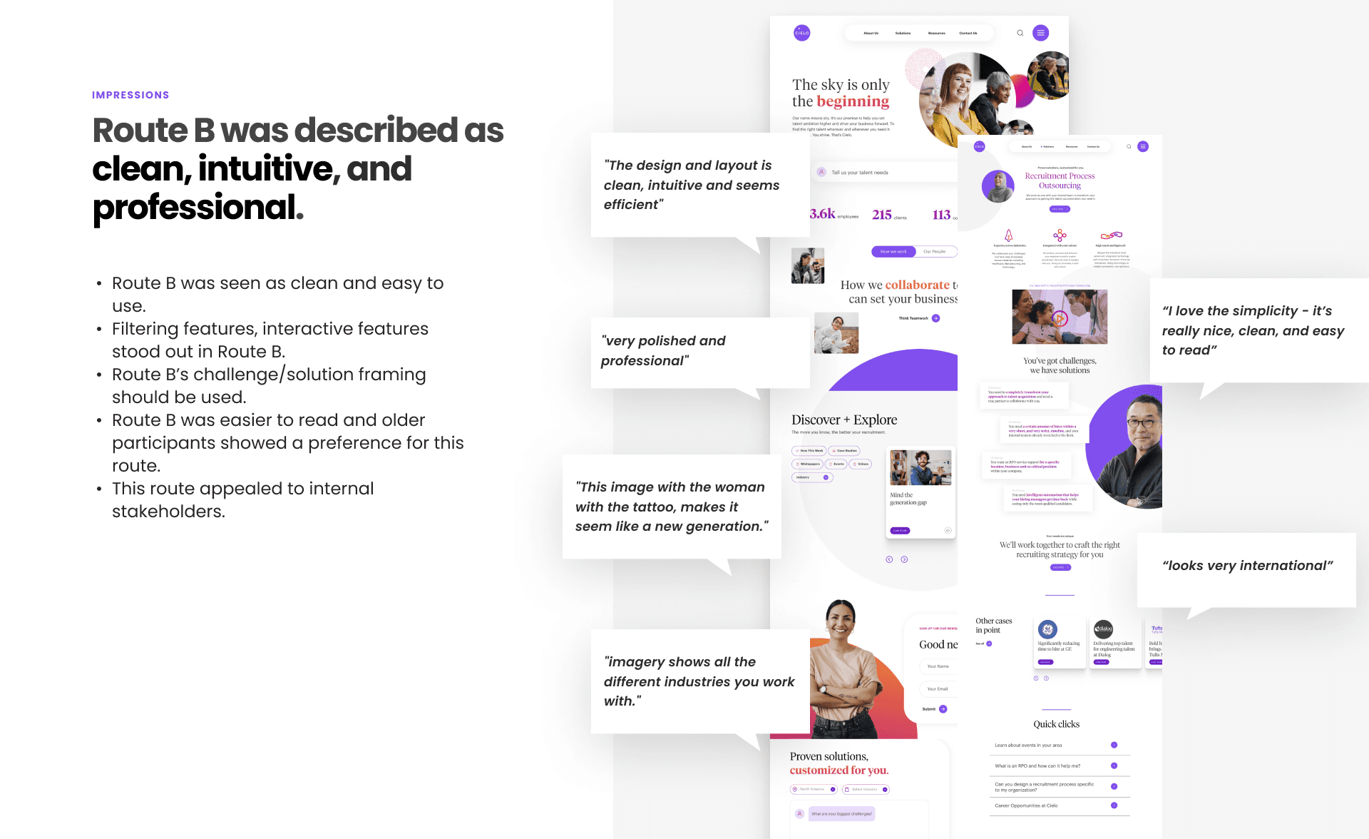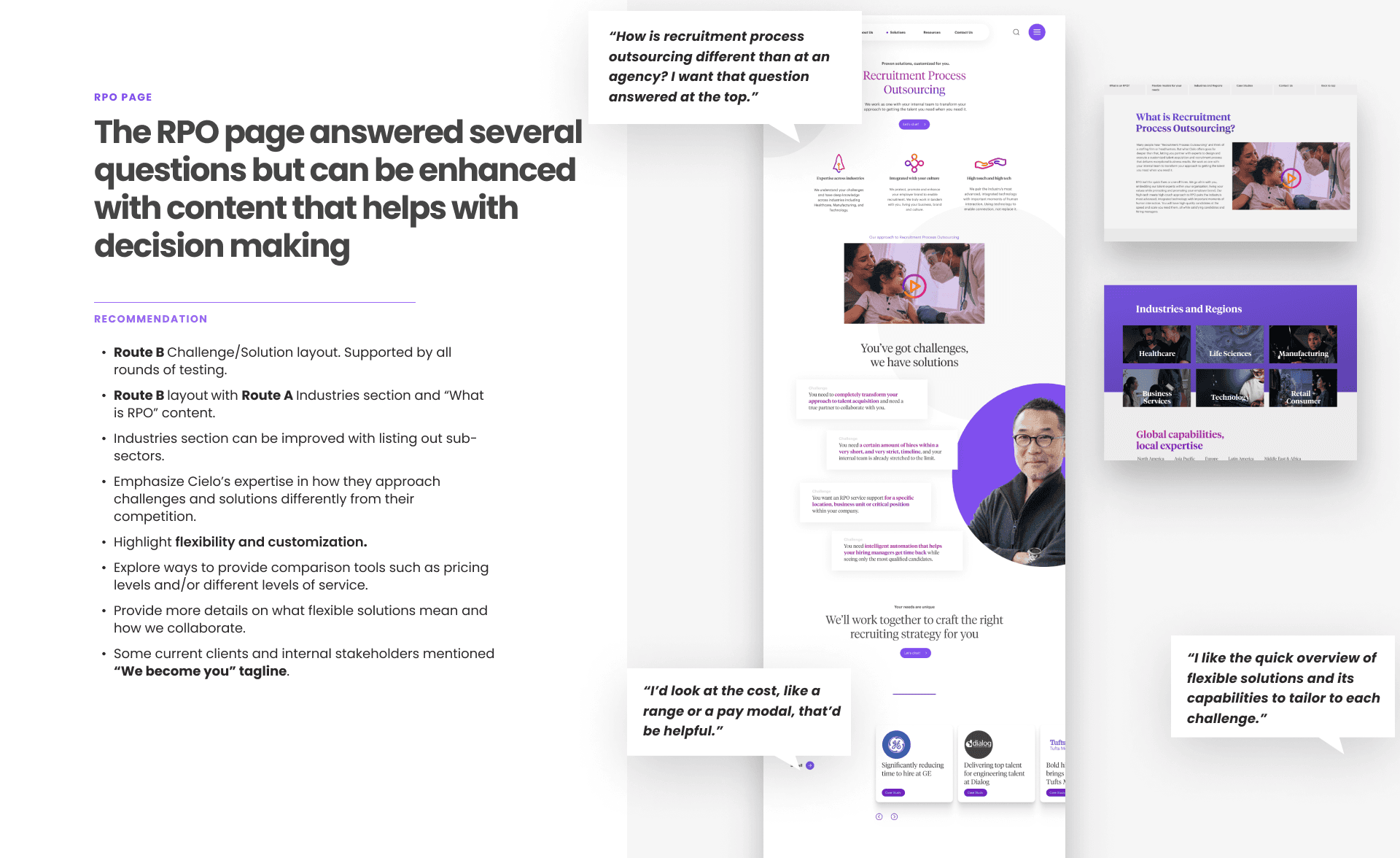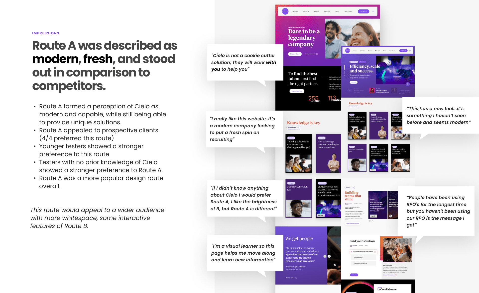 We conducted two rounds of user testing. Initially, we completed (8) 1-hour moderated qualitative interviews with both current Cielo clients and a subset of prospective clients. For the second round, we conducted (12) 1-hour moderated qualitative interviews with internal stakeholders. These interviews covered five key categories: Impression and Perception, Ease of Navigation, Usability, Information Quality, and Comparative Questions. This comprehensive approach allowed us to gather valuable insights from diverse perspectives, informing our design decisions effectively.