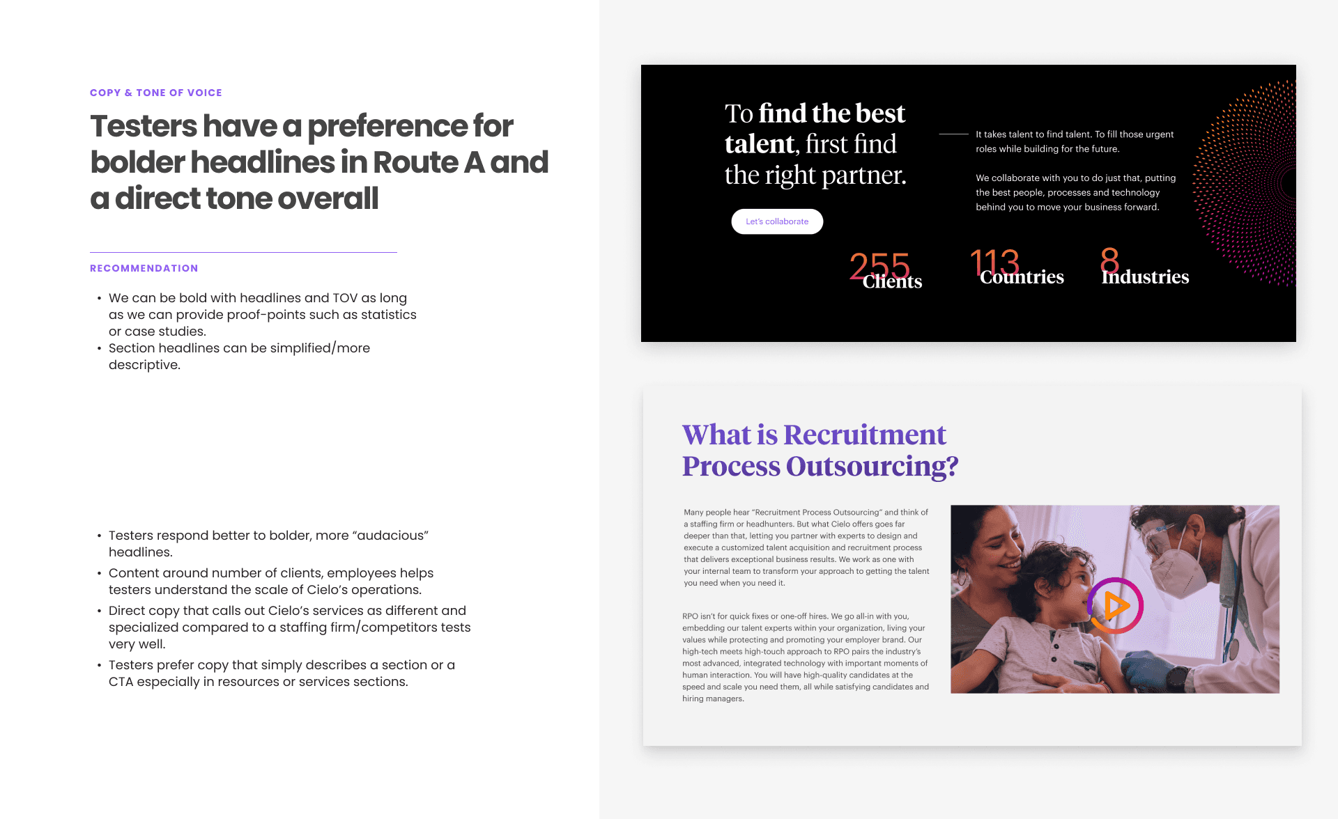 In collaboration with Cielo Talent, our objective was to amplify their refreshed brand identity and values through creative. Additionally, they wanted their new website to help accelerate buyer journeys through personalized data-driven experiences. Over an 8-month timeline, we assisted Cielo Talent in transforming their UX and content strategy by developing a comprehensive design system of modules to use in templates for responsive web and mobile designs and redesigned the user journey from discovery to conversion.